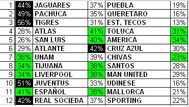Ahora incluyo la nueva modalidad, a cada posible resultado he puesto un porcentaje de probabilidad, ya que a pesar de ser fijos, algunos de ellos tienen mas probabilidades que otros. De este modo podrán guiarse mejor a la hora de hacer sus quinielas